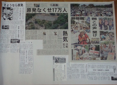 新聞は「さよなら原発」をどう報じているか 原発再稼動に反対する国民の運動を、新聞はどう報道しているでしょうか。 とかいうと、たつたは論文が書けるのかと思われそうですが、 私は単細胞。 見た目で判断。 記事の大きさで、その新聞社が、その問題をどれだけ大事に考えているか判断しています。 毎週行われている抗議行動は、どんどんと人数も、全国で呼応した取り組みも膨れ上がっていますが、16日に行われた集会および、国民運動に関する記事の大きさを、17日付け日刊紙で比べてみました。 ↓二枚とも「しんぶん赤旗」 ↓全国紙「M」 ↓地元紙 ↓全国紙「Y」 いずれも、同じ大きさの台紙に乗せて比べてみたものです。 いまこそ「原発ゼロの決断を」 日本共産党HP |