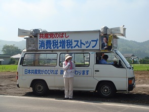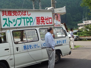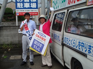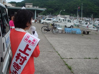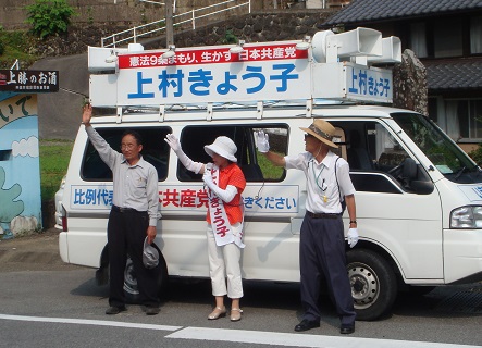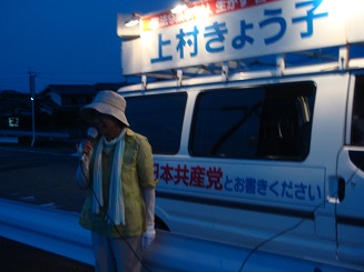 上村きょう子候補は、「くらしと景気、TPP、原発、憲法問題など、どれをとっても、アメリカいいなり、大企業・大金持ち中心の自民党政治をこのまま暴走させていいのでしょうか。日本共産党が伸びてこそ、国民の立場で自民党と対決し、政治を変えていくことができます。