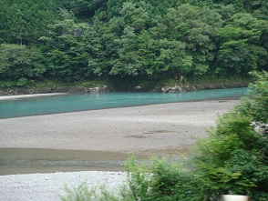 木頭を流れる那賀川、行く度に堆砂が増えています。 出原で訴える大沢町議