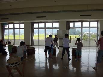 なつやすみ親子和太教室開催しました。 於:宝田公民館 二日間で、30名の参加がありました。4歳児〜小学生まで、ほとんどの子どもが、和太鼓に触れるのは初めてでしたが、一生命打っていました。 「子ども太鼓」のメンバーが先生になって、幼児さんたちにやさしく教えてあげていました。 また、「子ども太鼓クラブ」のメンバーが、龍神太鼓とまつり太鼓のデモ演奏をし、とても好評でした。 |