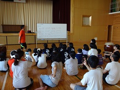 太鼓を打つためのストレッチや心の持ちようなど、わかりやすく楽しい教室でした。子ども達も生き生きと、先生の一挙一動を見逃さないように一生懸命でした。