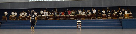 県民文化祭のための和太鼓合同練習 於:日和佐小学校体育館 9月15に行われる県民文化祭オープニングイベントで、和太鼓の合同演奏があります。「あなん子ども太鼓」から5名参加して練習しました。 曲目は、林英哲さん作曲の「千の海響」です。 少し難しかったですが、講師の先生方がとても熱心に、パワフルに教えてくださり、参加者一同、「がんばろう」という思いが強くなりました。 講師の先生方の模範演奏。力強さに圧倒されました。 |