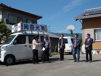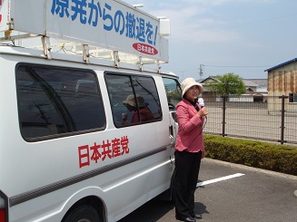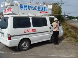 吉野川市へ 市議選支援で、ビラ配布、政党カー運行などを行いました。 行く先々で、日本共産党候補への暖かい声援も送っていただきましたが、終盤になるにつれ、選挙の激しさが感じられます。最後までのふんばりが決め手だと感じます。 政党カーで回る。調子の悪いデジカメで2、3枚写すことができました。 |