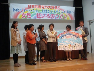 日本共産党徳島県女性後援会 「虹色のつどい」 参議院選挙を控え、勝利をめざす女性後援会のつどいが、午後、徳島市で開催されました。 上村きょう子選挙区予定候補、仁比そうへい比例代表予定候補から訴えがありました。 平和、人権、くらしと命がないがしろにされる政治のもと、さらにそれがひどくなっている状況ですから、何としても、日本共産党比例の5議席確保と、上村さんの当選で、政治を変えようと、熱い思いがみなぎる集会となりました。 具合の悪いカメラで、一か八か、写してみたら、なぜか、今日は、数枚ばっちり写すことができました。 健生職場女性後援会から激励をうける上村きょう子さんと仁比そうへいさん。 集会後、徳島駅前で、後援会員と、上村さん、仁比さんが訴えました。 ![]() 車上から訴える仁比さん、上村さんを応援する女性後援会員。徳島駅前。写真は上村さんのHPより |