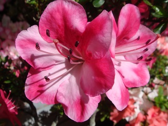 乳幼児、自宅での怪我 我が家でも 1昨日の夜、4歳の孫が自宅の階段から転げ落ちました。 昨日の朝、孫の顔は、「お岩さん」か「キョンシー」かというほど右目の上下がぼってり晴れて、青くなっていました。急いで病院につれて行ったのですが、見た目の割には「2、3日様子をみましょう」程度で済んで、本当にほっとしました。 見渡してみると、乳幼児にとって、階段、風呂場、すべる廊下、玄関の段差、机…、家の中は、危険がいっぱいです。もう大きくなったから、必要ないと階段上の柵を使わなくなった矢先でした。 子どもに危ないところは高齢者にも危ないわけですが、家庭内の安全に気をつけなければと、改めて思い知らされました。 近所のお宅で、さつきの展示が始まりました。毎年、丹精込めて咲かせた花を、公開してくれています。今一番の見ごろです。 |