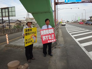 徳島建労の 「消費税大増税中止を求める全県一斉宣伝行動」に 県下各地で、一斉行動、約500人が参加ということです。 阿南市内でも、アピカ横交差点で、約50人が参加しました。それぞれ、旗、プラスターをかかげて、道行く人に アピールしました。 1997年に、消費税を3%から、5%にした時は、国民所得は増え続けていたのですが、それでも2%の消費税増税をふくむ9兆円の負担増で、家計の底が抜け、大不況の引き金を引く結果となったのです。 国民所得が減り続け、物価だけが上がりはじめて、暮らしがますます大変なときに、史上空前の大増税など許せません。 国民の暮らしと営業を破壊するだけでなく、日本経済をどん底に突き落としてしまうことは、誰が考えても明らかではないでしょうか。 私も、井坂市議等とともに参加し、建設労働組合のみなさんとともに、プラスターを掲げました。 井坂重弘市議とともに。 交差点の向こうも大増税反対の幟やプラスターが続いています。 孫たち集まる 藍住町に住んでいる孫たちが、泊まったので、我が家の孫たちと大はしゃぎ。夜遅くまで元気に遊びまわっていましたが、私はくたびれて寝ました。 |